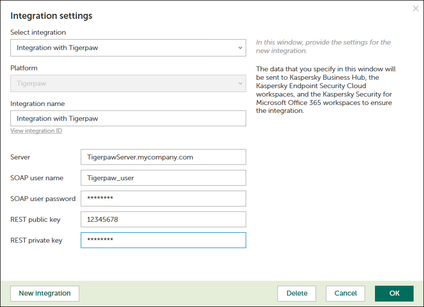 The settings are saved and then used by Kaspersky Security Integration with Tigerpaw to gain access to Tigerpaw.