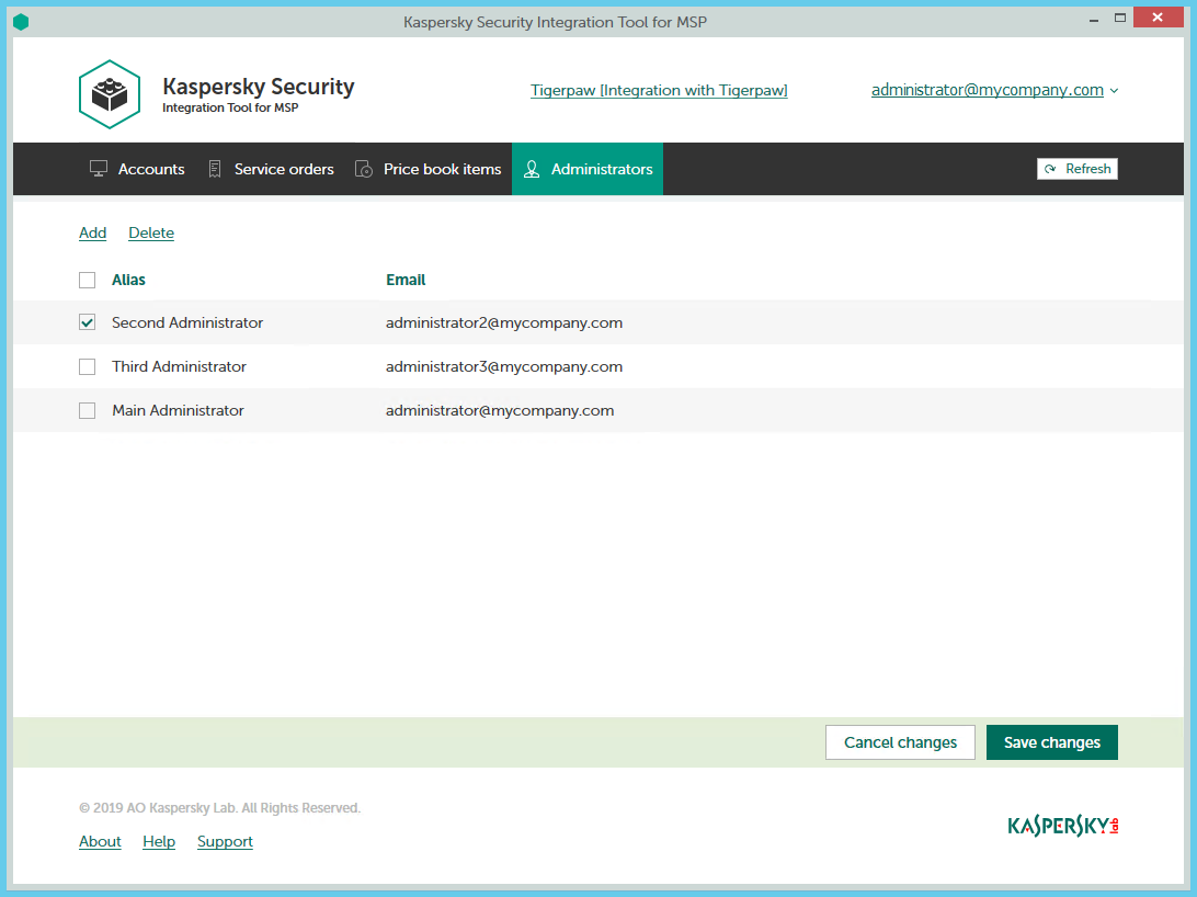 You can manage the administrators related to the integration with Kaspersky Business Hub. You can add the accounts of existing Kaspersky Business Hub users as administrators of your integration. You can also remove administrators from the integration if you do not want them to work with the integration.