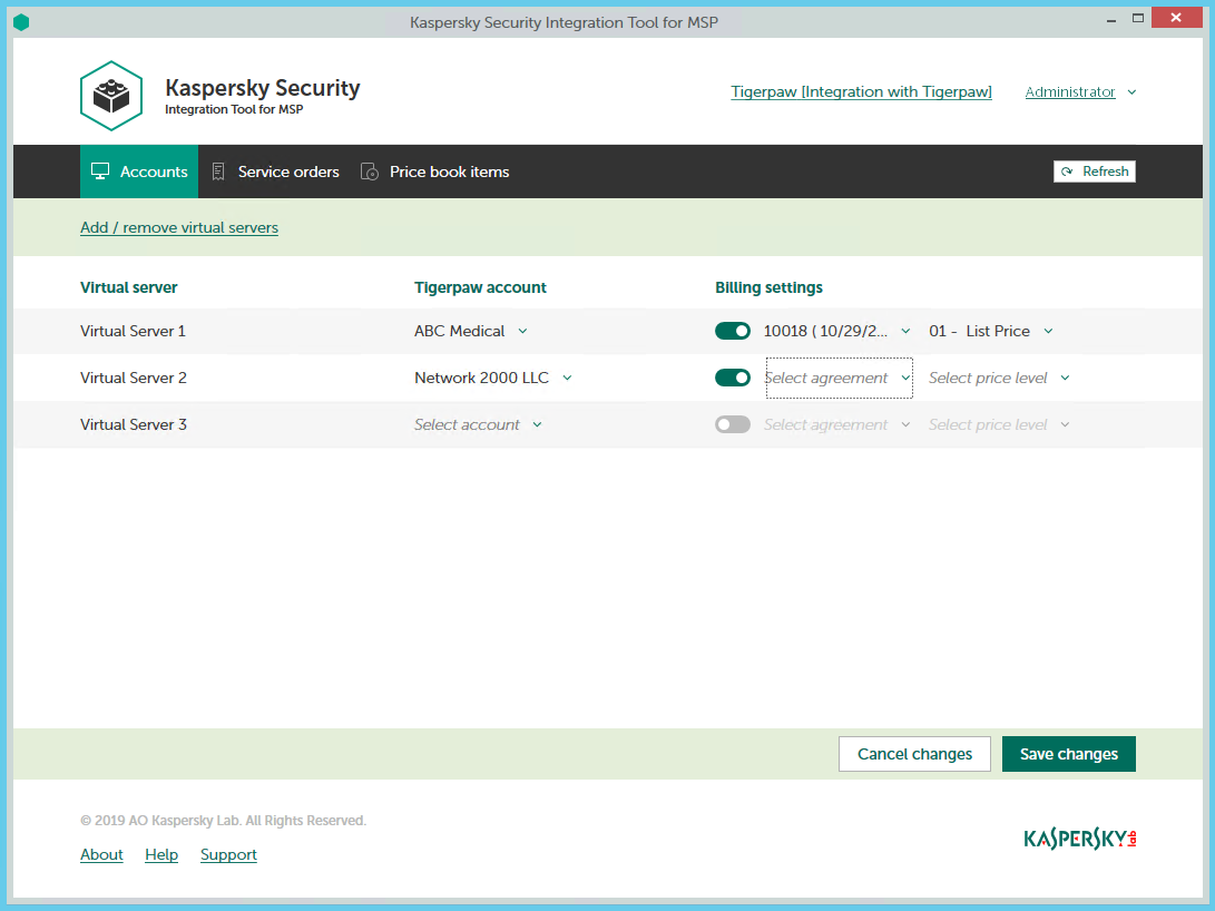 Use the Accounts tab in the Kaspersky Security Integration Tool for MSP window to set up and modify mapping between accounts in Tigerpaw and virtual servers or companies in your Kaspersky Lab solution. To set up mapping, accounts must be created in Tigerpaw, while virtual servers must be added to Kaspersky Security Center Administration Server or companies must be created in Kaspersky Business Hub.