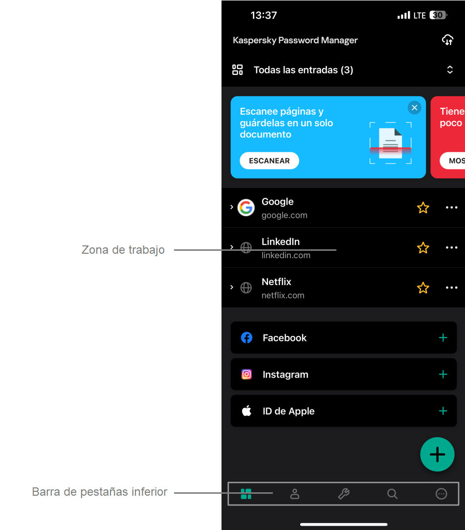 La ventana principal de la aplicación consta de la barra de pestañas inferior y de una zona de trabajo (consulte la imagen a continuación). La barra de pestañas inferior proporciona acceso rápido a funciones y configuración de Kaspersky Password Manager.