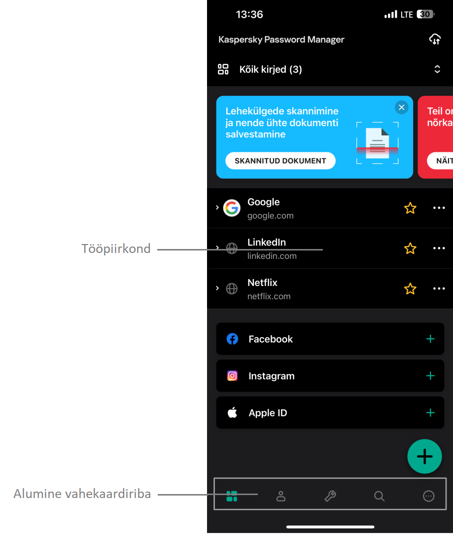 Rakenduse põhiaken koosneb alumisest vahekaardiribast ja tööpiirkonnast (vt allolevat pilti). Alumine vahekaardiriba võimaldab kiire juurdepääsu Kaspersky Password Manageri funktsioonidele ja seadetele.