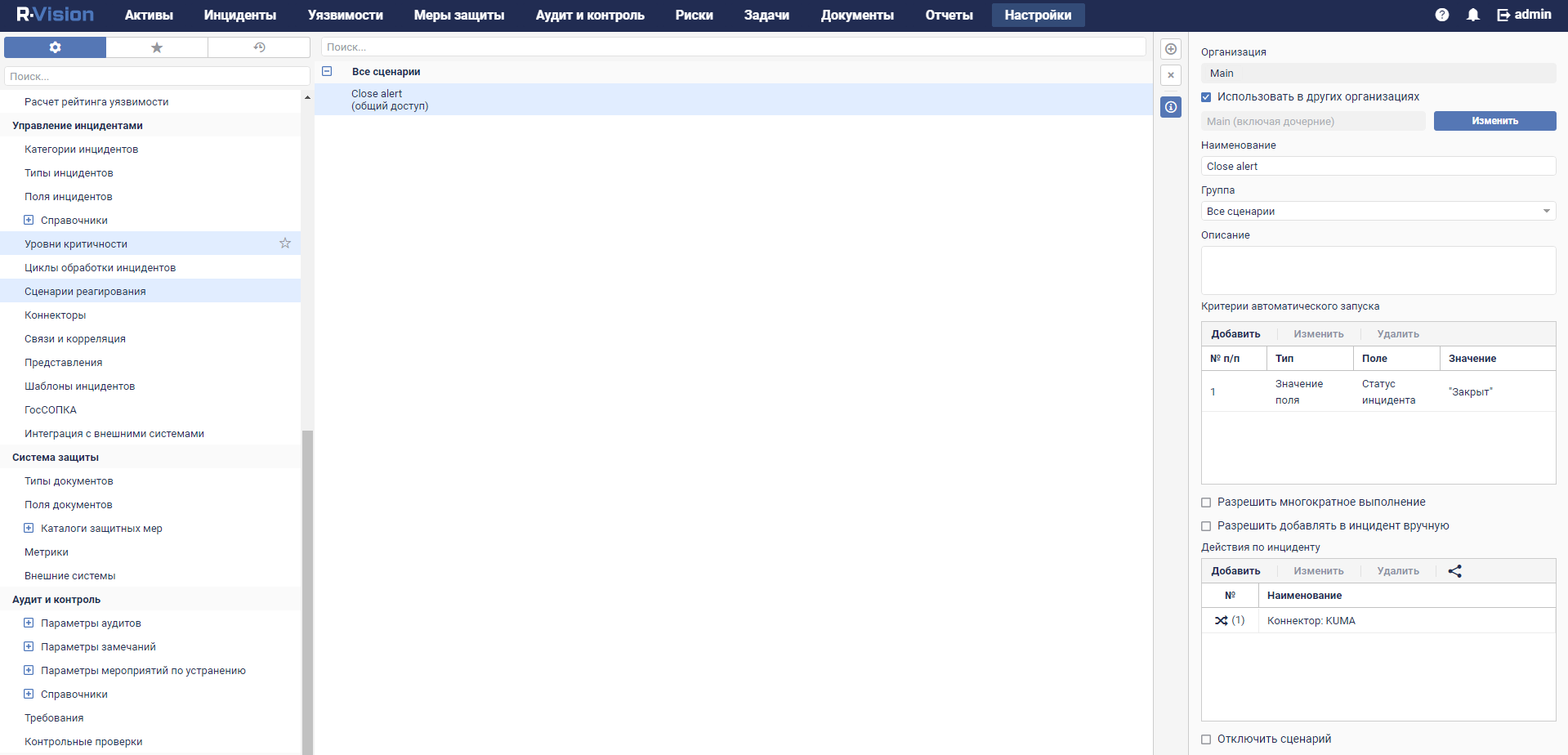 Правило на отправку в KUMA запроса на закрытие алерта при закрытии инцидента в R-Vision SOAR создано.