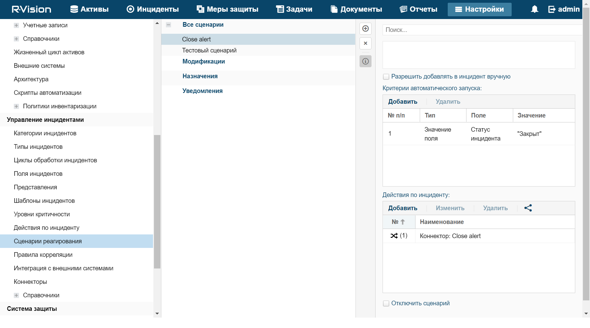 Чтобы создать правило на отправку в KUMA запроса на закрытие алерта при закрытии инцидента в R-Vision SOAR: