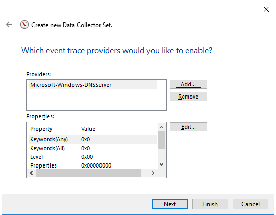 - Нажмите на кнопку Добавить... и в открывшемся окне выберите поставщика Microsoft-Windows-DNSServer.