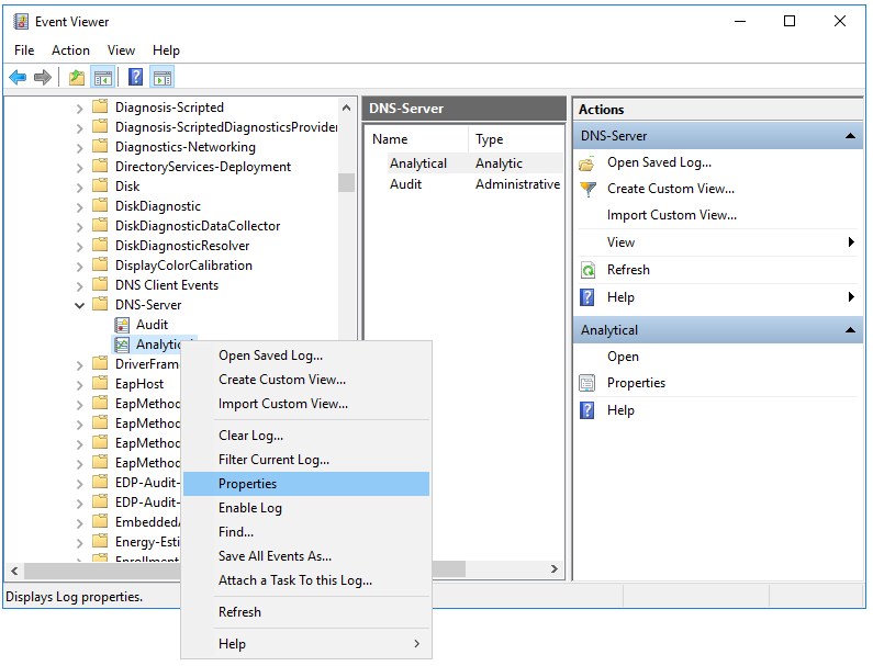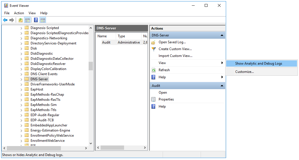 - Откройте контекстное меню директории DNS-Server и выберите пункт Вид → Отобразить аналитический и отладочный журналы.