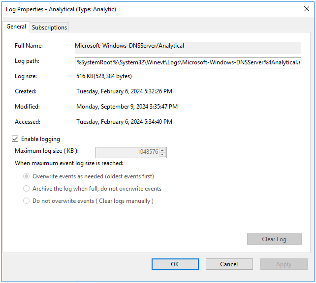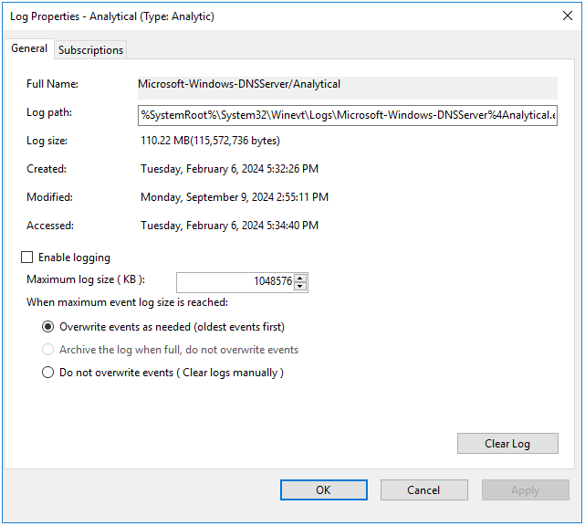 - В открывшемся окне убедитесь, что в поле Макс. размер журнала (КБ) указано значение
