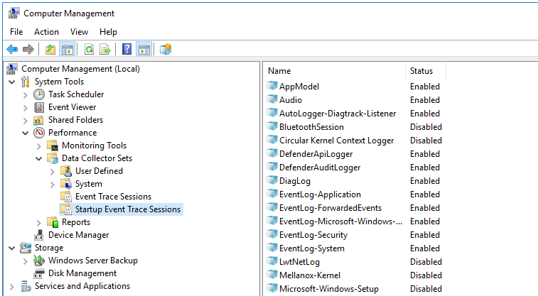 - В открывшемся окне перейдите в директорию Служебные программы → Производительность → Сеансы отслеживания событий запуска.