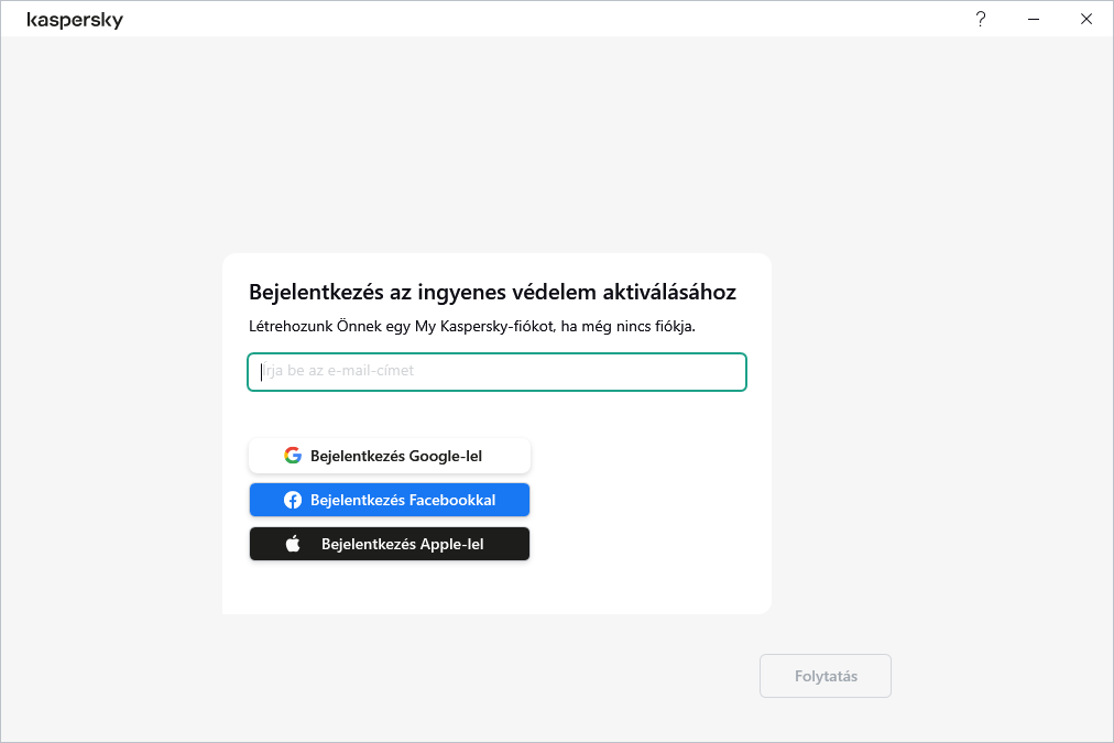 Ha nincs Google-, Facebook- vagy Apple-fiókja, létrehozhat egyet, és folytathatja a gyors My Kaspersky-bejelentkezés konfigurálását.