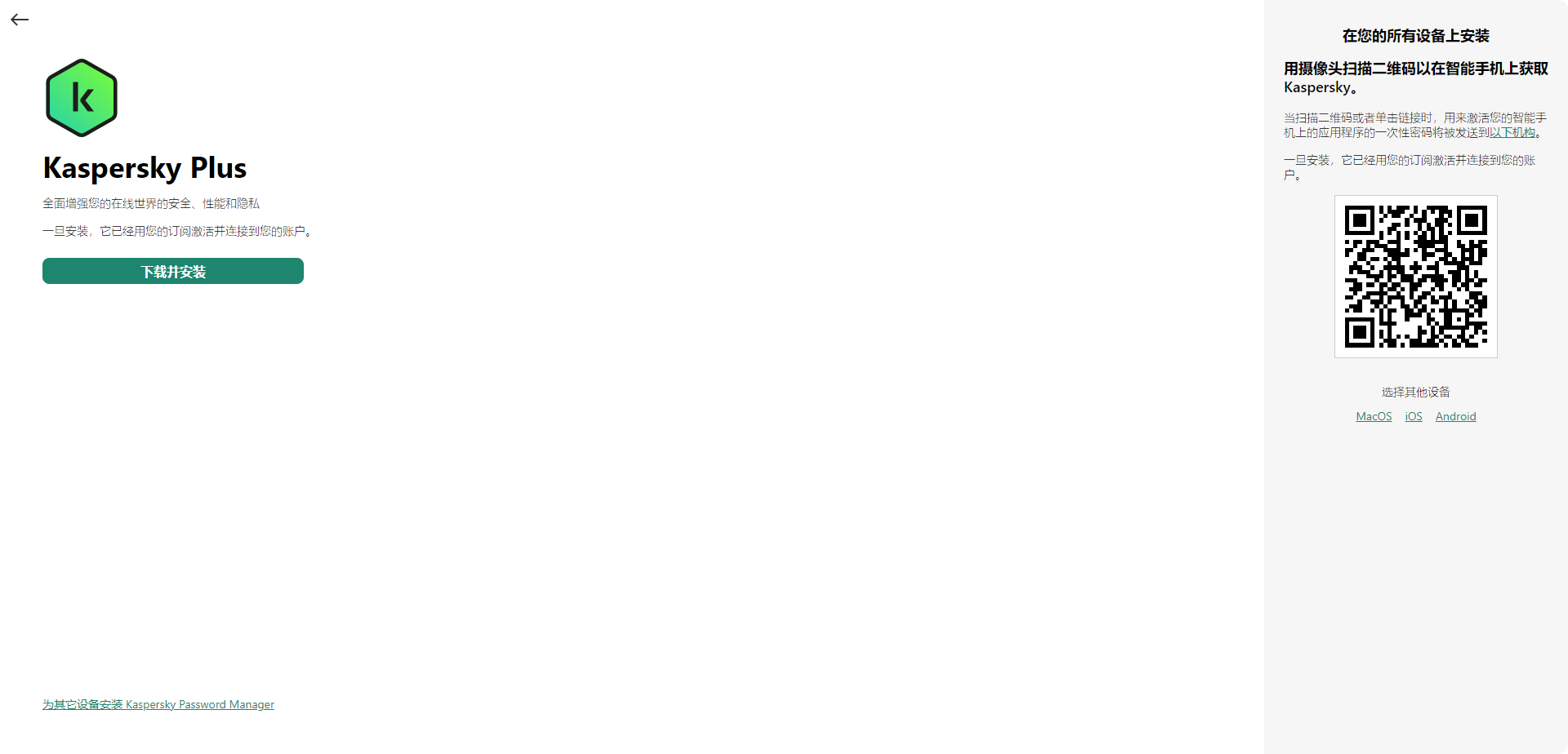您的激活码现在存储在您的“我的卡巴斯基”账户中。要保护新设备,请登录该账户并下载应用程序。您也可以在应用程序中手动输入激活码。