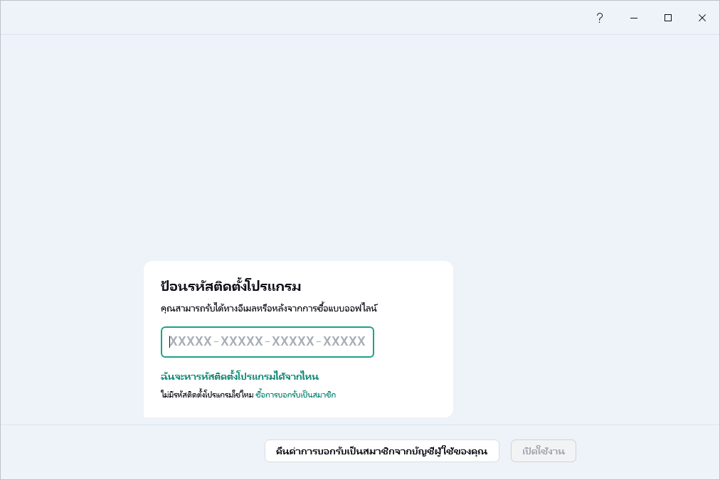- ป้อนรหัสติดตั้งโปรแกรมแล้วคลิก เปิดใช้งาน หรือคืนค่าการบอกรับเป็นสมาชิกจากบัญชีผู้ใช้ My Kaspersky ของคุณโดยคลิก คืนค่าการบอกรับเป็นสมาชิกจากบัญชีผู้ใช้ของคุณ