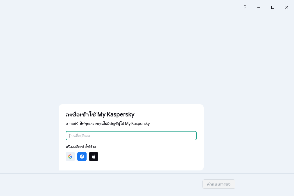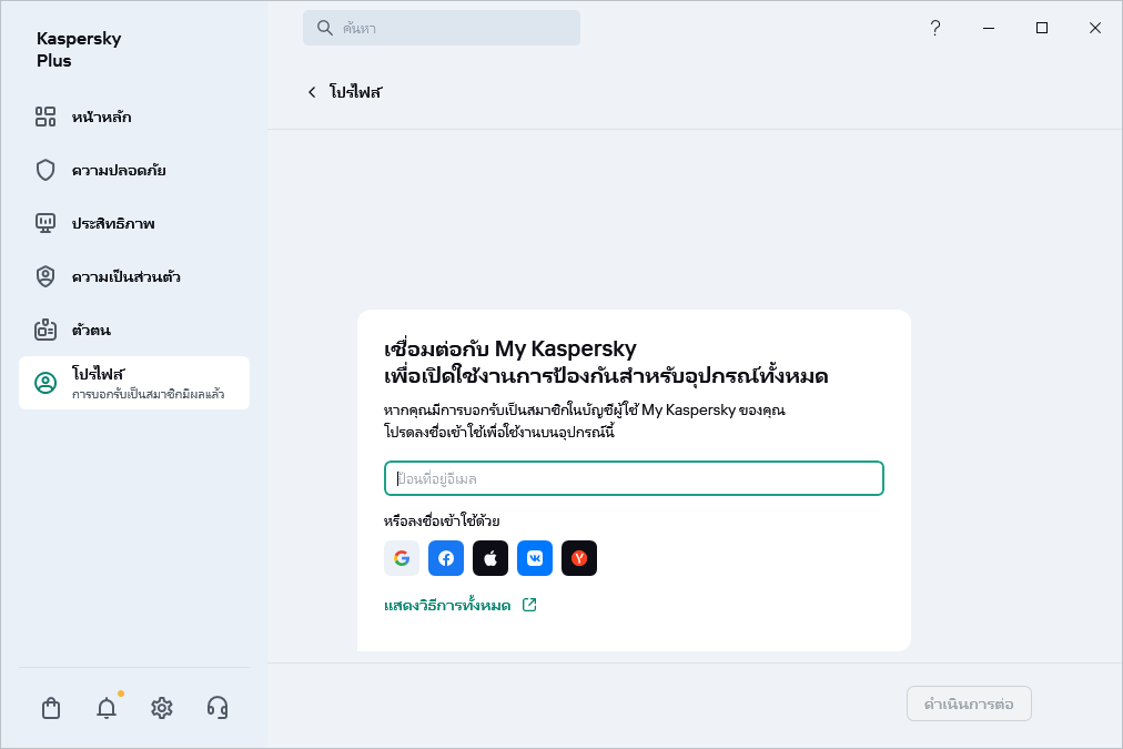 คุณสามารถลงชื่อเข้าใช้บัญชีผู้ใช้ My Kaspersky ของคุณได้ โดยใช้ที่อยู่อีเมลและรหัสผ่านของคุณ หรือด้วยบัญชีผู้ใช้ Google, Facebook, Apple, Yandex หรือ VK ของคุณได้ หากคุณมีบัญชีผู้ใช้อยู่แล้ว คุณสามารถกำหนดค่าการลงชื่อเข้าใช้แบบรวดเร็วด้วยบัญชีผู้ใช้ Google, Facebook, Apple, Yandex หรือ VK ของคุณในหน้าต่างที่ใช้สำหรับเชื่อมต่ออุปกรณ์ของคุณกับบัญชีผู้ใช้ My Kaspersky ของคุณได้ เป็นไปได้ว่าตอนที่สร้างบัญชีผู้ใช้ My Kaspersky คุณได้ใช้ที่อยู่อีเมลจากบัญชีผู้ใช้ Google, Facebook, Apple, Yandex หรือ VK ของคุณ